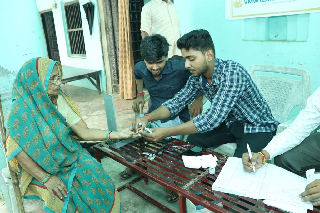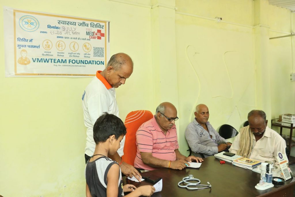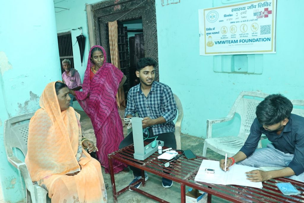 Deoria | Service to man is service to Narayan and with this feeling a free health camp was organized by VMW Team Foundation in Sanjav village located in Lar block of the district. 80 people were benefited from this medical camp organized in rural area. Blood pressure, sugar, heart disease, mental illness, respiratory disease, skin disease, eczema, itching, back knee pain, bone related diseases, eye related diseases and other patients were given necessary advice after checking their health in the camp.
